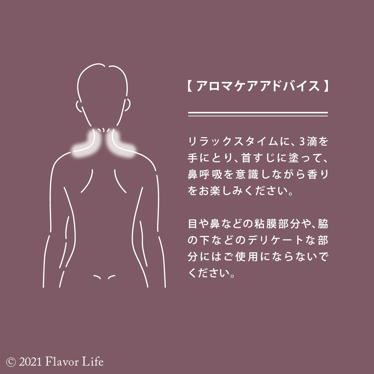 2~3滴を肌に直接塗って、鼻呼吸を意識しながら香りをお楽しみください。